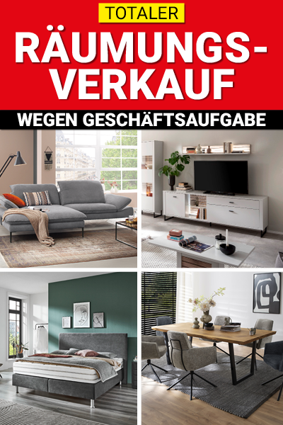 Schweren Herzens teilen wir dir mit, dass wir unser Möbelhaus nach über 65 erfolgreichen Jahren Küchen- und Möbelhandel für immer schließen werden – eine Ära geht zu Ende! Daher wird AB SOFORT der gesamte vorhandene Warenbestand und somit Millionenwerte total geräumt – RESTLOS ALLES MUSS RAUS!