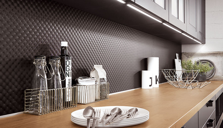 Eine weitere Möglichkeit ist es, die Arbeitsplatte optisch in der Rückwand