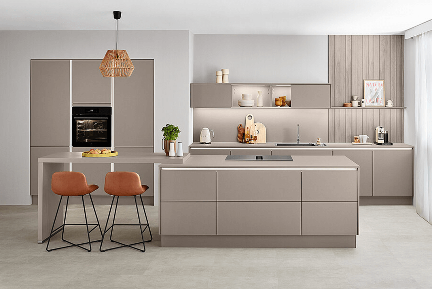 Die Inselküche ist die Königin unter den Küchenformen und ein echter Blickfang. Sie eignet sich hervorragend für offene Wohnkonzepte, da sie Küche und Wohnraum harmonisch miteinander verbindet. Eine Kücheninsel kann auf verschiedene Weise in das Küchendesign integriert werden. Häufig wird eine Küchenzeile durch eine freistehende Insel ergänzt, die entweder als zusätzliche Arbeitsfläche oder als Kochinsel dient. Aber auch L- oder große U-Küchen lassen sich mit einer Insel kombinieren. Viele moderne Küchenkonzepte setzen indes darauf, das Kochfeld direkt auf der Insel zu platzieren. Inselküchen bieten nicht nur eine imposante Optik, sondern auch viel Stauraum und Arbeitsfläche. Allerdings benötigen sie ausreichend Platz, um ihre Vorteile voll auszuspielen. Eine Raumgröße von mindestens 12 bis 13 Quadratmetern ist empfehlenswert, damit genügend Bewegungsfreiheit gegeben ist. Für Halbinseln sind 8-10 Quadratmeter eine gute Bezugsgröße. Ein weiterer Punkt, den es bei Inselküchen zu beachten gilt, sind die meist höheren Kosten im Vergleich zu anderen Küchenformen. Die offene Bauweise, der größere Materialaufwand und oft auch die Integration hochwertiger Elektrogeräte tragen dazu bei.